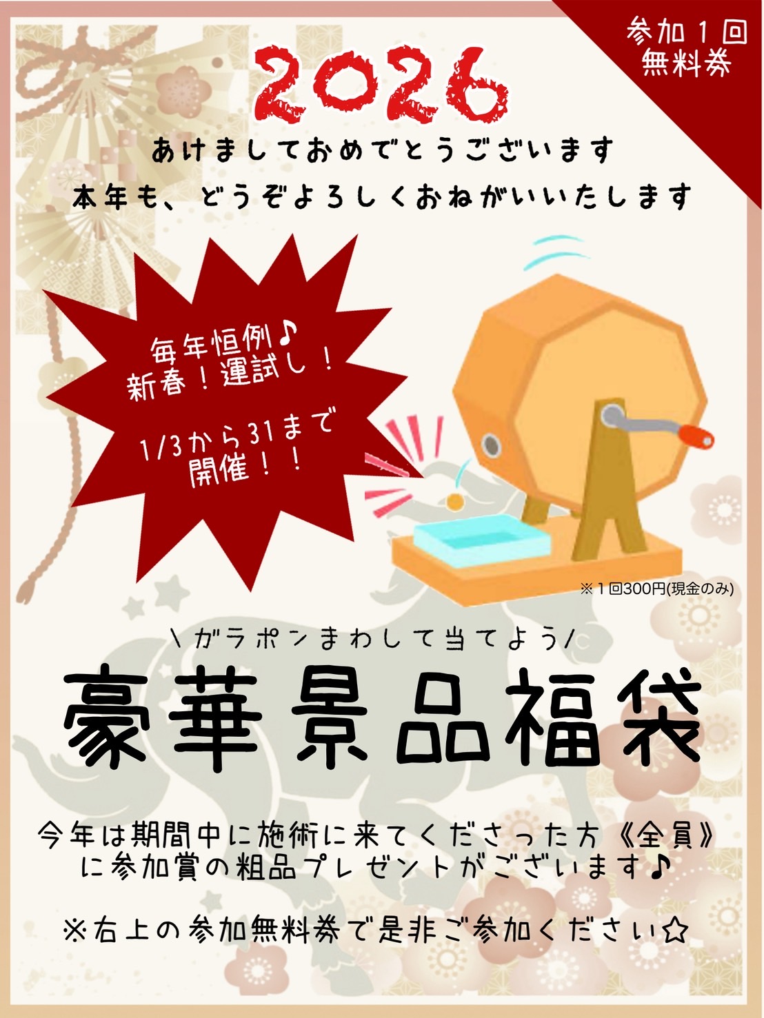 1月は3日から通常営業となります😃毎年恒例のイベントも開催いたしますので、どうぞ楽しみにしていてください♪